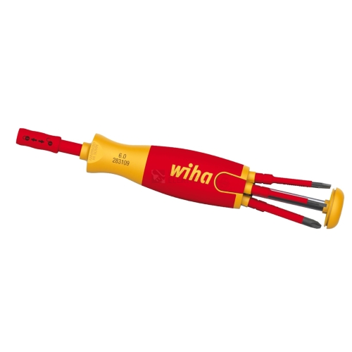 Popis Šroubovák se zásobníkem nástavců LiftUp electric je ideálním průvodcem každého elektrikáře při mobilním nasazení. Vložka s nástavcem schovaná v rukojeti nabízí místo pro 6 běžných simBitů a po stisknutí tlačítka vyjede ze zásobníku. Tím je zajištěno jednoduché vyjímání nástavců. Osvědčený držák ClicFix bezpečně zachytí všechny nástavce a spolehlivě je zablokuje. Tato technologie udělá ze zásobníku nástrojů univerzálně použitelný šroubovák. I v otázce bezpečnosti nabízí zásobníkový držák nástavců to maximálně možné. Jak zásobníkový držák nástavců, tak i obsažené slimBit jsou certifikovány podle mezinárodní normy IEC 60900. Štíhlé slimBity dlouhé 75 mm díky ochranné izolaci v přední oblasti plně integrované do bitu zajišťují perfektní přístup k hluboko položeným šroubovým nebo pružinovým svorkám. Dalším plusovým bodem je otočná krytka, která zajišťuje komfortní manipulaci. Použití Vhodný ke šroubování pod napětím do 1 000 V AC, zejména práci v terénu. Normy Zhotoveno dle IEC 60900. Upozornění Nepoužívejte pro nástavce tvaru C 6,3 a E 6,3. Nástavce slimBits 6 mm je nutno používat jen v držácích nástavců slimVario a slimTorque VDE (systém točivého momentu VDE). ##VIDEO:https://www.youtube.com/embed/USf-s-6MR_o## ##VIDEO:https://www.youtube.com/embed/8O9y253NZPk##