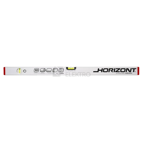 Vodováha 1000 mm HORIZONT se používá ve stavebnictví ke kontrole vodorovné nebo svislé plochy, své využití však najde i při běžných pracích v domácnosti. - délka: 1000 mm - 2 libely - přesnost 0,5 mm/m = 0,0285° - eloxovaný otěruvzdorný povrch - tloušťka stěny ALU profilu 1,5 mm - kapalina v libelách je UV stabilizovaná a fluorescenční - horizontální optická libela - usnadňuje a zvyšuje přesnost měření - vodováha je odolná proti provozním nárazům - 10 let záruka na libely - KAŽDÝ KUS ELEKTRONICKY TESTOVÁN Horizont vodováha se dvěma libelami, přesnost 0,5mm/m = 0,0285°, eloxovaný otěruvzdorný povrch, tloušťka stěny ALU profilu 1,5mm, kapalina v libelách je UV stabilizovaná a fluorescenční, horizontální optická libela - usnadňuje a zvyšuje přesnost měření, vodováha je odolná proti provozním nárazům, 10 let záruka na libely, KAŽDÝ KUS ELEKTRONICKY TESTOVÁN.