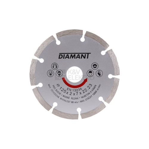 Průměr kotouče: 125 mm průměr otvoru: 22,2 mm (součástí balení je redukční kroužek z 22,2 na 20 mm) pevné uchycení diamantových segmentů k nosnému disku kotouče Diamantový kotouč představuje ideální nástroj pro příčné i podélné dělení různých stavebních materiálů, jakými jsou beton, cihla, zdivo či kámen. ##VIDEO:https://www.youtube.com/embed/8O9y253NZPk##