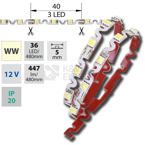 Ohebný LED pásek SMD3528, 3150-3300K (teple bílá), 4,2W, 36LED, 215lm/m, segment 40mm, 3LED/segment, IP20, DC 12V, životnost 25000h, šíře 5mm, bílý PCB pásek, max. délka pásku při jednostranném zapojení: 5m, opatřen samolepící páskou 3M. Balení po 1ks pásku o velikosti 480mm.