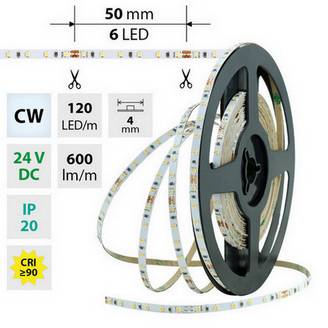 LED pásek SMD2216, studená bílá (6000K), 7,2W, 120LED, 600lm/m, segment 50mm, 6LED/segment, IP20, DC 24V, životnost 54000h, šíře 4mm, bílý PCB pásek, max. délka pásku při jednostranném zapojení: 5m, opatřen samolepící páskou 3M, UV stabilní.