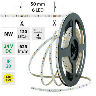 LED pásek SMD2216, neutrálně bílá (4200K), 7,2W, 120LED, 625lm/m, segment 50mm, 6LED/segment, IP20, DC 24V, životnost 54000h, šíře 4mm, bílý PCB pásek, max. délka pásku při jednostranném zapojení: 5m, opatřen samolepící páskou 3M, UV stabilní.