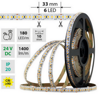 LED pásek SMD3528 na ovoce (2800-3100K), 14,4W, 180LED, 1400lm/m, segment 33mm, 6LED/segment, IP20, DC 24V, životnost 54000h, šíře 10mm, bílý PCB pásek, max. délka pásku při jednostranném zapojení: 5m, opatřen samolepící páskou 3M, UV stabilní.