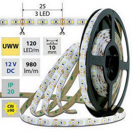 LED pásek SMD2835, 1900-2100K (ultra teple bílý UWW), 14W, 120LED, 980lm/m, segment 25mm, 3LED/segment, IP20, DC 12V, životnost 54000h, šíře 10mm, bílý PCB pásek, max. délka pásku při jednostranném zapojení: 5m, opatřen samolepící páskou 3M, UV stabilní. Na cívce 5m.