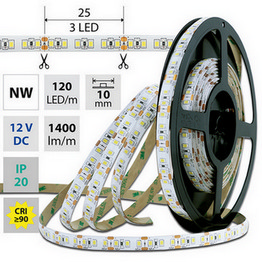 LED pásek SMD2835, 4000-4500K (neutrálně bílý NW), 14W, 120LED, 1400lm/m, segment 50mm, 3LED/segment, IP20, DC 12V, životnost 54000h, šíře 10mm, bílý PCB pásek, max. délka pásku při jednostranném zapojení: 5m, opatřen samolepící páskou 3M, UV stabilní.