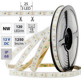 LED pásek SMD2835, 4000-4500K (neutrálně bílý NW), 14W, 120LED, 1250lm, segment 50mm, 3LED/segment, IP68, DC 12V, životnost 54000h, šíře 13mm, bílý PCB pásek, max. délka pásku při jednostranném zapojení: 5m, opatřen samolepící páskou 3M, UV stabilní. Balení 5m.