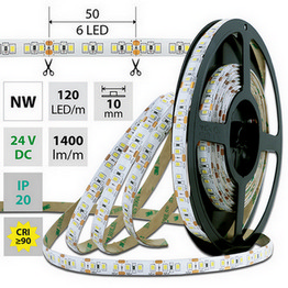 LED pásek SMD2835, 4000-4500K (neutrálně bílý NW), 14W, 120LED, 1400lm/m, segment 50mm, 6LED/segment, IP20, DC 24V, životnost 54000h, šíře 10mm, bílý PCB pásek, max. délka pásku při jednostranném zapojení: 5m, opatřen samolepící páskou 3M, UV stabilní. Balení 5m.
