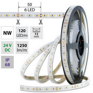 LED pásek SMD2835, 4000-4500K (neutrálně bílý NW), 14W, 120LED, 1250lm/m, segment 100mm, 6LED/segment, IP68, DC 24V, životnost 54000h, šíře 13mm, bílý PCB pásek, max. délka pásku při jednostranném zapojení: 5m, opatřen samolepící páskou 3M, UV stabilní. Balení 5m.