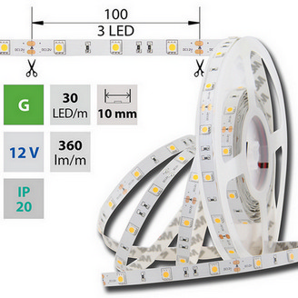 LED pásek SMD5050, 515-525nm (zelená), 7,2W, 30LED, 360lm, segment 100mm, 3LED/segment, IP20, DC 12V, životnost 35000h, šíře 10mm, bílý PCB pásek, max. délka pásku při jednostranném zapojení: 5m, opatřen samolepící páskou 3M.
