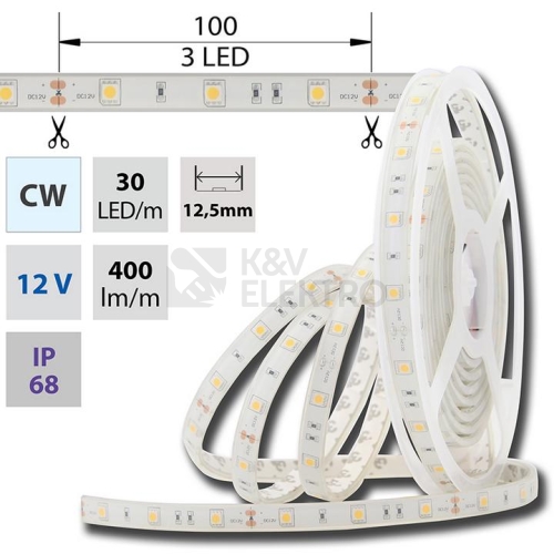 LED pásek SMD5050, 5800-6100K (studeně bílá), 7,2W, 30LED, 400lm, segment 100mm, 3LED/segment, IP68, DC 12V, životnost 35000h, šíře 12 ,5mm, bílý PCB pásek, max. délka pásku při jednostranném zapojení: 5m, opatřen samolepící páskou 3M. Páska pouze usnadňuje montáž, fixace pomocí spon je nezbytná.