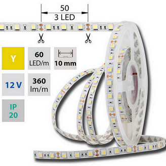 LED pásek SMD5050, 585-595nm (žlutá), 14,4W, 60LED, 360lm, segment 50mm, 6LED/segment, IP20, DC 12V, životnost 35000h, šíře 10mm, bílý PCB pásek, max. délka pásku při jednostranném zapojení: 5m, opatřen samolepící páskou 3M.