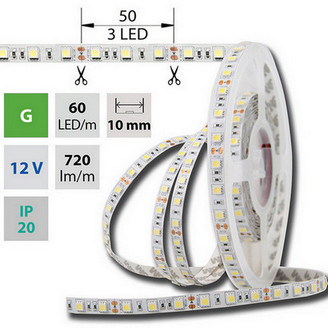 LED pásek SMD5050, 515-525nm (zelená), 14,4W, 60LED, 720lm, segment 50mm, 3LED/segment, IP20, DC 12V, životnost 35000h, šíře 10mm, bílý PCB pásek, max. délka pásku při jednostranném zapojení: 5m, opatřen samolepící páskou 3M.