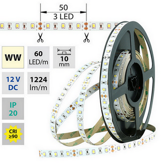 LED pásek SMD2835, 2800-3100K (teple bílý WW), 14,4W, 60LED, 1224lm/m, segment 50mm, 3LED/segment, IP20, DC 12V, životnost 54000h, šíře 10mm, bílý PCB pásek, max. délka pásku při jednostranném zapojení: 5m, opatřen samolepící páskou 3M, UV stabilní.
