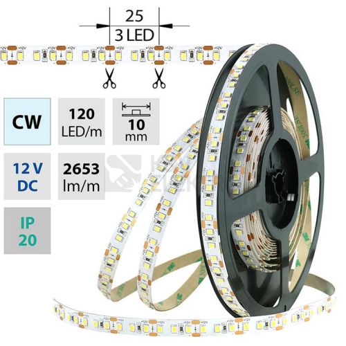 LED pásek SMD2835, 5800-6100K (studeně bílý CW), 28,8W, 120LED, 2653lm, segment 25mm, 3LED/segment, IP20, DC 12V, životnost 35000h, šíře 10mm, bílý PCB pásek, max. délka pásku při jednostranném zapojení: 5m, opatřen samolepící páskou 3M, UV stabilní.