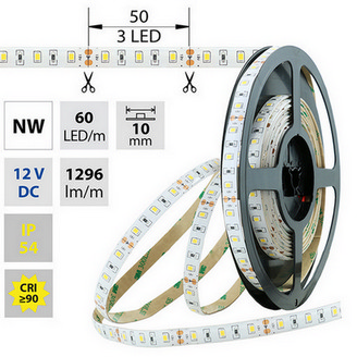 LED pásek SMD2835, neutrálně bílá (4200K), 14,4W, 60LED, 1296lm/m, segment 50mm, 3LED/segment, IP54, DC 12V, životnost 54000h, šíře 10mm, bílý PCB pásek, max. délka pásku při jednostranném zapojení: 5m, opatřen samolepící páskou 3M, UV stabilní.