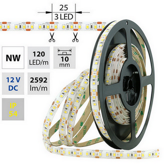LED pásek SMD2835, neutrálně bílá (4200K), 28,8W, 120LED, 2592lm/m, segment 25mm, 3LED/segment, IP54, DC 12V, životnost 54000h, šíře 10mm, bílý PCB pásek, max. délka pásku při jednostranném zapojení: 5m, opatřen samolepící páskou 3M, UV stabilní.
