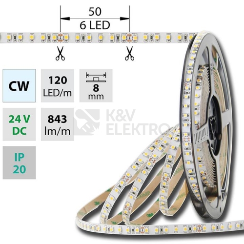 LED pásek SMD3528, studená bílá (6000K), 9,6W, 120LED, 843lm/m, segment 50mm, 6LED/segment, IP20, DC 24V, životnost 54000h, šíře 8mm, bílý PCB pásek, max. délka pásku při jednostranném zapojení: 8m, opatřen samolepící páskou 3M, UV stabilní.