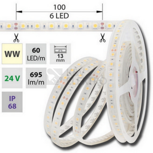 LED pásek SMD5050, 2800-3100K (teple bílá), 14,4W, 60LED, 695lm, segment 100mm, 6LED/segment, IP68, DC 24V, životnost 35000h, šíře 13mm, bílý PCB pásek, max. délka pásku při jednostranném zapojení: 7m, opatřen samolepící páskou 3M. Páska pouze usnadňuje montáž, fixace pomocí spon je nezbytná.