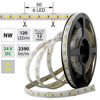 LED pásek SMD5050, neutrálně bílá (4200K), 28,8W, 120LED, 2390lm/m, segment 50mm, 6LED/segment, IP54, DC 24V, životnost 54000h, šíře 12mm, bílý PCB pásek, max. délka pásku při jednostranném zapojení: 5m, opatřen samolepící páskou 3M, UV stabilní.
