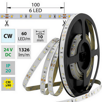LED pásek SMD2835, studená bílá (6000K), 14,4W, 60LED, 1326lm/m, segment 100mm, 6LED/segment, IP20, DC 24V, životnost 54000h, šíře 10mm, bílý PCB pásek, max. délka pásku při jednostranném zapojení: 5m, opatřen samolepící páskou 3M, UV stabilní.