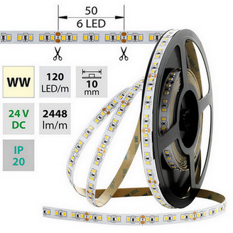 LED pásek SMD2835, 2800-3100K (teple bílý WW), 28,8W, 120LED, 2448lm/m, segment 50mm, 6LED/segment, IP20, DC 24V, životnost 54000h, šíře 10mm, bílý PCB pásek, max. délka pásku při jednostranném zapojení: 5m, opatřen samolepící páskou 3M, UV stabilní.