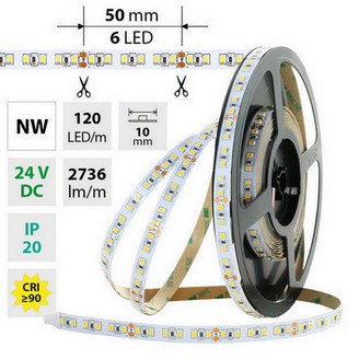 LED pásek SMD2835, neutrálně bílá (4200K), 28,8W, 120LED, 2736lm/m, segment 50mm, 6LED/segment, IP20, DC 24V, životnost 54000h, šíře 10mm, bílý PCB pásek, max. délka pásku při jednostranném zapojení: 5m, opatřen samolepící páskou 3M, UV stabilní.
