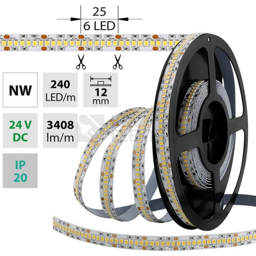 LED pásek SMD2835, neutrálně bílá (4200K), 38,4W, 240LED, 3408lm/m, segment 25mm, 6LED/segment, IP20, DC 24V, životnost 54000h, šíře 12mm, bílý PCB pásek, max. délka pásku při jednostranném zapojení: 5m, opatřen samolepící páskou 3M, UV stabilní.