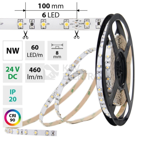 Stmívatelný LED pásek SMD3528, neutrální bílá (4200K), 4,8W, 60LED, 460lm/m, CRI>90, segment 100mm, 6LED/segment, IP20, DC 24V, životnost 54000h, šíře 8mm, bílý PCB pásek, max. délka pásku při jednostranném zapojení: 10m, opatřen samolepící páskou 3M, UV stabilní. Délka 50m.