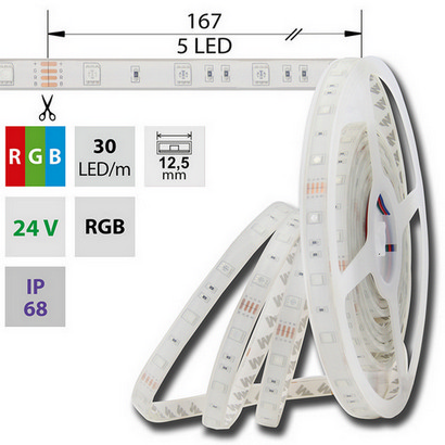 LED pásek SMD5050, RGB - barevný, 7,2W, 30LED, segment 167mm, 5LED/segment, IP68, DC 24V, životnost 35000h, šíře 12,5mm, bílý PCB pá sek, max. délka pásku při jednostranném zapojení: 7m, opatřen samolepící páskou 3M.