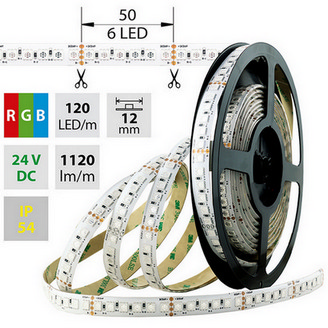 LED pásek SMD5050, (barevný RGB), 28,8W, 120LED, 1120lm/m, segment 50mm, 6LED/segment, IP54, DC 24V, životnost 54000h, šíře 12mm, bílý PCB pásek, max. délka pásku při jednostranném zapojení: 5m, opatřen samolepící páskou 3M, UV stabilní.