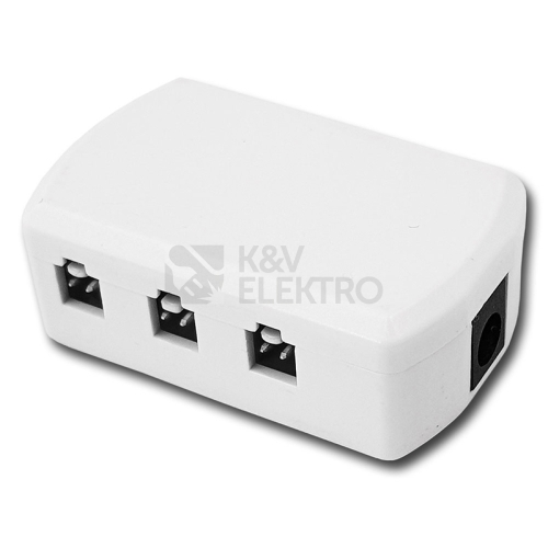 EasyLine MX6 rozbočovač 6pólový, 4A, vstup konektor 5,5mm F, 6x výstup DC konektor M. Ze spodní strany opatřen samolepkou, pomocí které lze rozbočovač upevnit.