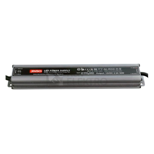 LED napěťový zdroj 30W pro LED pásky, vhodný pro profesionální použití. TÜV certifikace, krytí IP67, výstup 12VDC, 2,5A. Vstup: 100-240VAC, 47-63Hz, účinnost > 80%, PF > 0,95, materiál krytu: hliník. Rozměry: 232x37x25mm, hmotnost: 380g. Při volbě zdroje počítejte s výkonovou rezervou min. 20%.