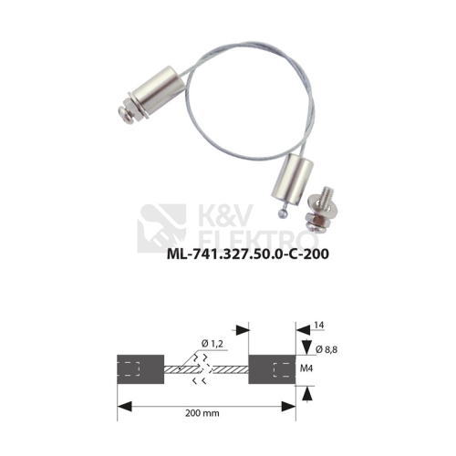 Závěsné ocelové lanko, 1,2x200mm, zakončené válečkem 14 x 8,8mm M4