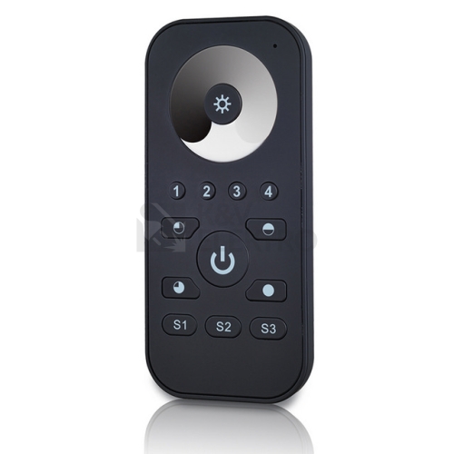 RF dálkový ovladač pro řízení jasu (stmívání) jednobarevných LED pásků umožňuje nezávislé i společné řízení až 4 skupin RF přijímačů (nejsou součástí), každá skupina může mít neomezeně přijímačů. Rozměry ovladače: 120×55×17mm, napájení 3xAAA baterie (nejsou součástí), dosah cca 20m. Součástí balení magnetický držák, který lze upevnit pomocí 3M pásky, nebo vrutů (obojí součástí).