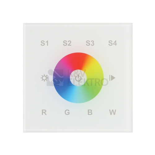 RF dálkový ovladač pro řízení jasu a barevných režimů RGB a RGBW LED pásků umožňuje řízení jedné skupiny RF přijímačů (nejsou součástí), tato skupina může mít neomezeně přijímačů. 10 barevných efektů, 4 scény pro uložení barvy/efektu, dosah cca 20m. Instalace pomocí vrutů (součástí). Rozměry ovladače: 86×86×30,9mm, materiál: plast+sklo, napájení AC230V.