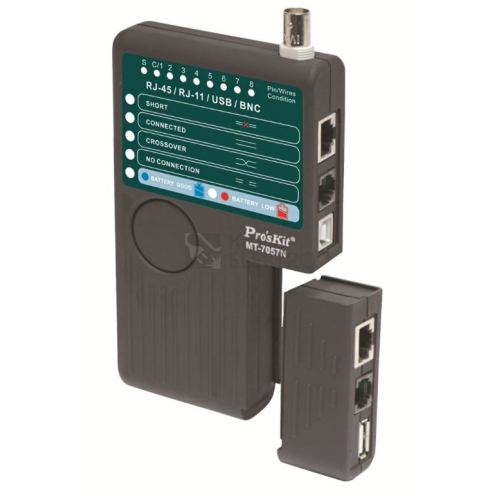 Jednoduchý tester USB, síťových a koaxiálních kabelů. Testuje RJ45 EIA/TIA-568A/B,AT&T258A,RJ11/12 USOC4/6/8,EtherneT 10BaseT,Token Ring, Telefonní,USB,BNC koaxiální kabel a kabelové systémy. Vhodné pro stíněné i nestíněné LAN kabely LED indikace a zvukové signály Testovací vzdálenost: 500 metrů Ochrana před napětím PoE Snadné ovládání pomocí jednoho tlačítka Napájení pomocí 1 ks 9V baterie (NEDA 1604/6F22) (nepřiložena) Příslušenství: taška, manuál, konektor RJ45 na female BNC Rozměry 160 x 85 x 25 mm