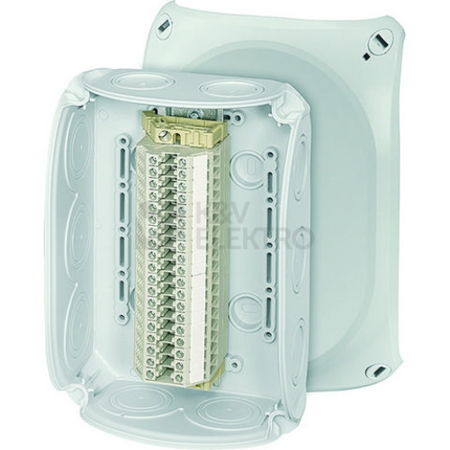 Kabelová krabicová rozvodka z vysoce kvalitního termoplastu s řadovými svorkami pro hliníkové a měděné vodiče. Pro nástěnné aplikace v budovách nebo chráněnou instalaci ve venkovním prostředí. Se stěnovými úchyty a upevněním víka pomocí rychlouzávěrů. S páskem pro uchycení víka. S 19 řadovými svorkami do 4 mm². Kabelový vstup přes pružné těsnící membrány ve dně a stěnách skříně. Následné použití kabelových vývodek odstraněním těsnící membrány je možné.
