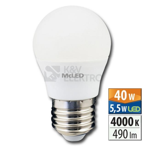 LED žárovka G45 kapka 5,5W (ekvivalent 40W), patice E27, 230V, 4000K - neutrální bílá, světelný tok 490lm, vyzařovací úhel 180°, Ra>80, úspora až 86%, životnost až 25.000h, 20.000 spínacích cyklů, A+, rozměry 45 x 82 mm, nestmívatelná