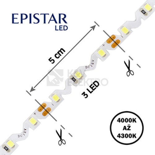 Flexibilní pásek s LED SMD diodami, efektivně vyzařujícími světlo, je vhodný pro dekorativní nasvícení interiérů, náročné osvětlovací systémy, ale i pro reklamní účely. Velkou předností je velká svítivost a napájení malým napětím 12 V DC a snadné ovládání pomocí volitelných ovladačů, kontrolérů a stmívačů. Díky sério-paralelnímu zapojení lze pásek jednoduše dělit po jednotlivých modulech. Pro snadnou montáž je jedna strana pásku opatřena oboustrannou lepící páskou firmy 3M. Extra tvarovatelnosti a ohebnosti je dosaženo speciálním tvarem tištěného spoje na pásku (PCB) - pásek tak lze ohýbat ve všech směrech.Technické parametry: Příkon (max.): 4,8 W/m Světelný tok: 390 lm/m Barevná teplota: 4000 - 4300 K Počet LED/m: 60 LED/m Typ LED čipu: 3528 Výrobce LED čipu: Epistar Vyzařovací úhel: 120° Index podání barev: Ra > 80 Krytí: IP20 Pracovní teplota: -25 °C až +50 °C Napájecí napětí: 12 V DC Počet LED / Délka modulu: 3 LED / 5 cm Rozměry: 6 x 2,4 mm Balení: 5 m