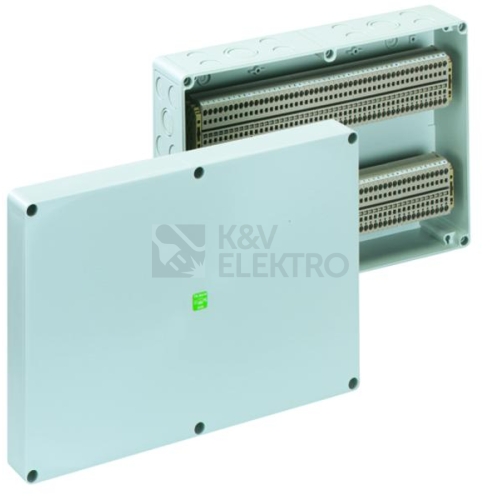 Skříň pro řadové svorkovnice, se stupněm krytí IP54/IP66, Jmenovitý průřez 4mm², Ui=400V AC, polystyren, Vnitřní místa pro připevnění, pro standardní instalace ve vnitřním prostoru, osazené 100 bezšroubovými svorkami 4mm³ (typ Weidmüller ZDU 4), Rozměry: 360 x 254 x 111mm, Přiložené příslušenství: 18 Vývodka IP54 M20 Rozsah těsnění 8-13,5mm, 4 Vývodka IP54 M25 Rozsah těsnění 9-18,5mm, 2 Vývodka IP54 M32 Rozsah těsnění 13-23mm, 1 Vývodka IP54 M40 Rozsah těsnění 17-30mm