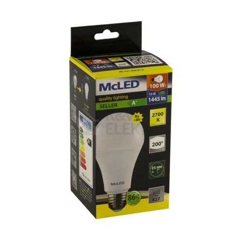 Sviťte LED žárovkou E27 od české firmy McLED s velmi vysokou svítivostí, která je náhradou klasických 100 W světelných zdrojů. Žárovky E27 jsou nejběžnějším druhem žárovky a používají se například do lustrů, stropních a nástěnných světel. Žárovka McLED díky LED technologii šetří až 86 % energie, a tedy i vašich nákladů. LED žárovka E27 má příkon 15 W a světelný tok dosahuje 1445 lm. Svítí teplou bílou barvou (2700 K) podobnou klasickým vláknovým žárovkám. Žárovka má tvar hrušky a stupeň krytí je IP20. Díky LED technologii vydrží žárovka v průměru svítit 25.000 hodin a 15.000 spínacích cyklů. Vyzařovací úhel je 200°. Prohlédněte si i další LED žárovky E27 nebo vybírejte mezi takzvanými miňonkami, tedy LED žárovkami E14 vhodnými pro menší svítidla. Zakoupit můžete také stmívací žárovky, LED pásky, LED trubice či halogenové žárovky. V našem sortimentu najdete také široký sortiment svítidel vhodných pro žárovky E27. O firmě McLED Společnost McLED s.r.o. je mladá česká firma, která se specializuje na kvalitní a úsporné LED osvětlení, se sídlem ve Vestci u Prahy. Kromě LED pásků nabízí McLED také širokou škálu LED žárovek, svítidel na stěnu, vestavného osvětlení či zářičů.