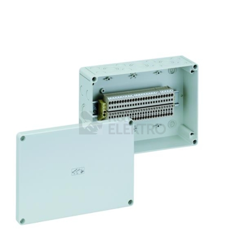 Skříň pro řadové svorkovnice, se stupněm krytí IP54/IP66, Jmenovitý průřez 4mm², Ui=400V AC, polystyren, Vnitřní místa pro připevnění, pro standardní instalace ve vnitřním prostoru, osazené 25 bezšroubovými svorkami 4mm³ (typ Weidmüller ZDU 4), Rozměry: 254 x 180 x 90mm, Přiložené příslušenství: 8 Vývodka IP54 M20 Rozsah těsnění 8-13,5mm, 2 Vývodka IP54 M25 Rozsah těsnění 9-18,5mm, 1 Vývodka IP54 M32 Rozsah těsnění 13-23mm