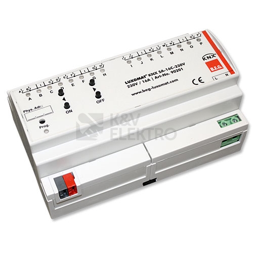 Spínací aktory KNX SA-8C-230V a KNX SA-16C-230V přijímá KNX-telegramy a spíná 8 až 16 spotřebičů nezávisle na soběKaždý výstup je řízen prostřednictvím monostabilního reléKaždý výstup lze individuálně naprogramovat pomocí ETS3/4. Volba může být provedena mezi logickými linkami, zprávami o stavu, blokovými funkcemi, funkcí centrálního spínání a komplexních časových funkcí, jako je například zpoždění aktivace / deaktivace a funkce časovače schodišťového osvětlení. Funkce přednastavených stavů jsou také k dispoziciV případě instalace zařízení na lištu, jsou čtyři L-svorky vnitřně přemostěnyPřístroj je určen pro pevnou instalaci na lištu DIN v silnoproudých rozvodechMontáž musí být provedena v suchých interiérechNapětí : 230 V ACRozměry : (8 TE) 86 x 144 x 60 mmVýstupní napětí : 230 V AC 50 HzStupeň krytí : IP20 / třída IIOkolní teplota : 0 °C až +45 °CBydlení : Plast LEXAN UL-94-V0Ukazatele : červený LED programování LED zelený LED: stav kanáluProvoz ruční : Ruční ovládání spínacích kanálů přímo na zařízeníKNX TP 256: AnoSpínací kapacita : 1900 W, cos φ = 1Výrobce: B.E.G. Brück Electronic GmbHBarva: bíláVýr. číslo: 90201Typ: KNX SA-16C-230 V