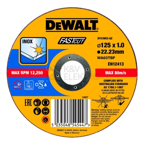 Řezný kotouč na nerez Fastcut značky DeWALT s průměrem 125 mm je profesionální pomocník na řezání kovů. Při jeho výrobě posloužil jako nosný materiál zesílený sklolaminát, kombinovaný s pryskyřičným pojivem. O dlouhou životnost řezného kotouče se postará oxid hlinitý. Specifikace řezného kotouče na nerez Fastcut DeWALT DT43902 Společnost DeWALT se může pochlubit výrobou nářadí a příslušenství mající dlouhou životnost a udržující si úctyhodný standard kvality. Řezný kotouč Fastcut je ukázkou spolehlivé kvality produktů této značky. Kotouč má průměr 125 mm, jeho tloušťka je 1,0 mm a průměr otvoru pro jeho upínání je 22,23 mm. Řezný kotouč Fastcut 125 mm je určen pro úhlové brusky na řezání nerezové oceli, železných i neželezných – barevných – kovů (měď, mosaz atd.). Nosným materiálem řezného kotouče Fastcut je zesílený sklolaminát, lepený pryskyřičným pojivem. Dlouhou životnost a stálý řezný výkon po celou dobu životnosti kotouče Fastcut pak zajišťuje korund (oxid hlinitý), což je nerost, který má po diamantu nejvyšší tvrdost. Prohlédněte si naši nabídku nářadí a měřicích přístrojů od osvědčených výrobců a doplňte svojí pracovní výbavu. Vybírat můžete z ručního, elektrického i AKU nářadí. Certifikáty výrobku Řezný kotouč na nerez 125x22,2x1,0 Fastcut Dewalt DT43902 splňuje příslušné normy ČSN. ##VIDEO:https://www.youtube.com/embed/8O9y253NZPk## O společnosti DeWALT DeWalt je americká společnost založená v roce 1922 a slavící nejeden úspěch na poli prodeje elektrického nářadí a nástrojů. Výrobky DeWALT jsou známy pro svou kvalitu a spolehlivost, kterou ocení profesionálové i domácí kutilové. Společnost se zaměřuje na inovace a technologie hledající profesionální řešení pro pracoviště a zajištění absolutní jistoty i v těch nejnáročnějších podmínkách. V naší nabídce od této úspěšné a oblíbené značky naleznete nářadí, jako třeba AKU nářadí, sady bitů, vrtačky a vrtací kladiva a další.