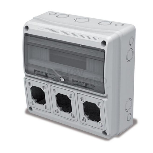 Plastová skříň AcquaCOMBI 3975 s 3 otvory pro umístění zásuvek, ve vyšším krytí IP65, 16mod., rozměry: 330x330x150mm, svorkovnice PE/N součástí, montáž na omítku, průhledná dvířka, barva: světle šedá.Plastová skříň AcquaCOMBI 3975 s otvorem pro umístění zásuvek, ve vyšším krytí IP65, rozměry: 330x330x150mm, (výška x šířka x hloubka), 16mod., IK08, plastová, materiál ABS, zkouška žhavou smyčkou 650°C, bezhalogenová a UV odolná, montáž na povrch, barva: světle šedá, rozsah teplot -25°C +85°C, aplikované normy: EN 62208, balení: 1ks (fólie), polykarbonátová průhledná dvířka, PE svorkovnice součástí (2x16 mm2 + 4x10 mm2) / N svorkovnice součástí (2x16 mm2 + 4x10 mm2), hladké boky (stěny) - pro vyvrtání otvoru a osazení vývodkou (vrchní a spodní strana má stěny s předlisovanými vstupy pro vyvrtání vstupního otvoru a následného osazení příslušnou vývodkou), schopnost rozptylu tepla: 32W.