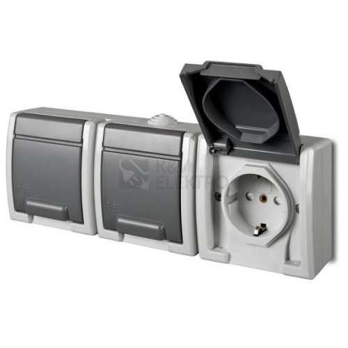 ATLAS 19089 IP55 Zásuvka 3x 2P+PE SCHUKO, 3-nás. vodorovná, na povrch, šedáSpínače a zásuvky ve vyšším krytí ATLAS IP55 s gumovou průchodkou (pro kabely do průměru 13,5 mm a trubky do 16 mm) jsou speciálně navrženy do prostředí se zvýšeným výskytem vlhkosti a prachu. Provedení v šedé barvě RAL 7035 a ovládacím prvkem v barvě RAL 7043 a odolnost proti mechanickým nárazům IK07 předurčuje použití ve výrobních provozech, montážních halách, garážích, dílnách apod. Kompaktní a zároveň masivní pouzdro z odolného plastu zaručují dlouhou životnost přístrojů.Popisovací štítek, který je součástí spínače, zajistí přehledné označení každého přístroje, určeno pro nástěnnou montáž (na omítku), UV odolný materiál. Splňuje požadavky norem ČSN EN 60669-1 (spínače) a ČSN IEC 60884-1 (zásuvky), pro montáž na hořlavé podklady doporučujeme použití nehořlavé podložky, pro rozsah teplot od -25°C do +70°C.