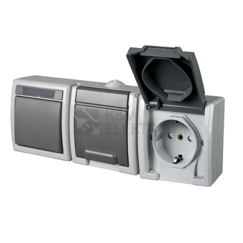 ATLAS 19095 IP55 Přepínač střídavý č.6 + zásuvka 2x 2P+PE SCHUKO vodorovně, na povrch, šedýSpínače a zásuvky ve vyšším krytí ATLAS IP55 s gumovou průchodkou (pro kabely do průměru 13,5 mm a trubky do 16 mm) jsou speciálně navrženy do prostředí se zvýšeným výskytem vlhkosti a prachu. Provedení v šedé barvě RAL 7035 a ovládacím prvkem v barvě RAL 7043 a odolnost proti mechanickým nárazům IK07 předurčuje použití ve výrobních provozech, montážních halách, garážích, dílnách apod. Kompaktní a zároveň masivní pouzdro z odolného plastu zaručují dlouhou životnost přístrojů.Popisovací štítek, který je součástí spínače, zajistí přehledné označení každého přístroje, určeno pro nástěnnou montáž (na omítku), UV odolný materiál. Splňuje požadavky norem ČSN EN 60669-1 (spínače) a ČSN IEC 60884-1 (zásuvky), pro montáž na hořlavé podklady doporučujeme použití nehořlavé podložky, pro rozsah teplot od -25°C do +70°C.