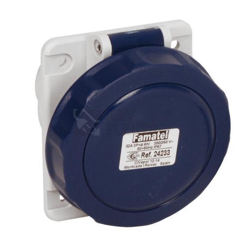 Zásuvka vestavná 24233 IP67/230V/32A/3P 6h, šikmá 10° - SpeedPROPrůmyslové vidlice, zásuvky a spojky splňující požadavky norem IEC 60309.Široký sortiment zásuvek a vidlic od 16 A do 125 A byl navržen a vyroben podle nejnáročnějších norem kvality a vyhovuje i těm nejvyšším požadavkům na vodotěsnost, odolnost proti teplotním vlivům a nárazům.Optimální ergonomie - Speciální povrchová úprava zaručuje optimální přilnavost při manipulaci a navíc je zjednodušeno samotné otvírání víčka - vše díky promyšlenému ergonomickému designu.Preciznost - Nerezová bezpečnostní spona chrání vidlici / spojku proti otevření vnitřní části, zároveň zaručuje rychlé otevření a zavření při instalaci kabelu.Šroubová vývodka - Exkluzivní inovovaná kabelová šroubová vývodka s antivibračním systémem uchycení kabelu poskytuje maximální trvanlivost spoje a pohodlnou údržbu.Připojení vodičů - V produktové řadě SpeedPRO jsou všechny šroubky přístupné z jedné strany, není nutné otáčet vidlicí/spojkou během instalace.Snadná montáž - Konstrukce vidlic a spojek umožňuje umístění optimálně dle potřeb instalace díky vestavěným závěsům.Univerzálnost - Konstrukce vidlic a zásuvek je vhodná pro všechny typy aplikací a použití v extrémních podmínkách (vlhkost, prašnost, mastnota,...).