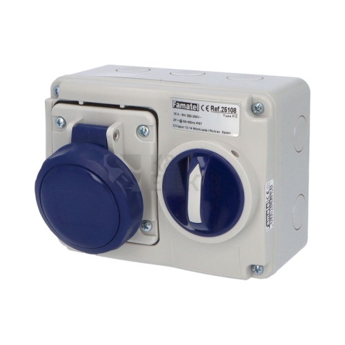 Zásuvka nástěnná blokovaná 25108 IP67/230V/16A/3P 6hPrůmyslové zásuvky splňující požadavky norem IEC 60309. Jedná se o zásuvky vybavené speciálním vačkovým spínačem 0-1 s funkcí blokády - tzn. že při nepřipojené vidlici nelze otočit spínačem do zapnuté polohy. Zásuvky jsou osazené v plastové krabici, která je určena pro montáž na omítku (na povrch).