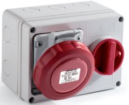 Zásuvka nástěnná blokovaná 25109 IP67/400V/16A/4P 6hPrůmyslové zásuvky splňující požadavky norem IEC 60309. Jedná se o zásuvky vybavené speciálním vačkovým spínačem 0-1 s funkcí blokády - tzn. že při nepřipojené vidlici nelze otočit spínačem do zapnuté polohy. Zásuvky jsou osazené v plastové krabici, která je určena pro montáž na omítku (na povrch).